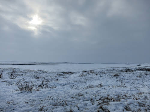 Still behind, I was careful how I negotiated my way up but my lack of speed got me stuck in the snow at an odd angle. I tried to move the snowmobile but only made the situation worst. At that moment, I was alone on the tundra, no one in sight. I felt a long moment of solitude. I figured Bruno and the crew would eventually realize I was missing and would return. After what felt like a long while, I heard and then saw a snowmobile coming towards me. It was Bruno on his shiny black snowmobile. But even the two of us did not manage to move the machine. Luckily, our host Olaf came by on his way to the van and stopped to help. Within seconds, he pulled my snowmobile free. It was obvious he had done this a few times before…