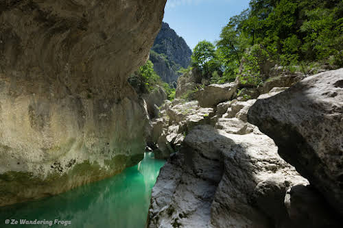 Part of hiking in the Sentier de l’Imbut in the Verdon Gorge (Gorges du Verdon in French) is reaching the Styx, which in Greek mythology was one of the rivers heading to Hell. Easily recognizable by the large and deep holes dug into the rock by erosion. Because of the tight curves, the Verdon river slows down and gives a striking deep green color. But better be careful as a step too close to the edge will lead to a dangerous fall.