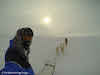 With a 50-km (31-mile) trail ahead of us, we needed to leave on a timely schedule. Our movement around camp signaled a prompt departure to the dogs. On with the sled, on with the dogs. I stepped on my sled and with a last quick glance back, “mush mush” we went. The sky remained overcast that morning, compared with the beautiful blue sky of the day before, and gave a unique character to the ride. Sky and land merged as one giant white horizon, with limited landscape elements to give a grasp to reality.